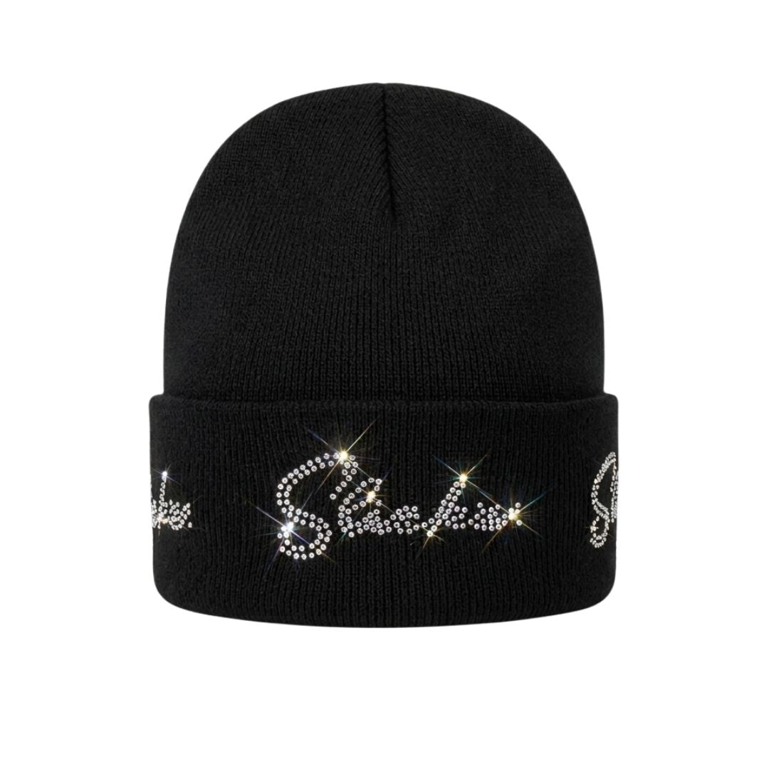 The crystal-studded lettering wraps the fold with a bold, jeweled finish that hits different whether you're layering up for the block or stepping into the spotlight. Clean silhouette. Maximum impact.
